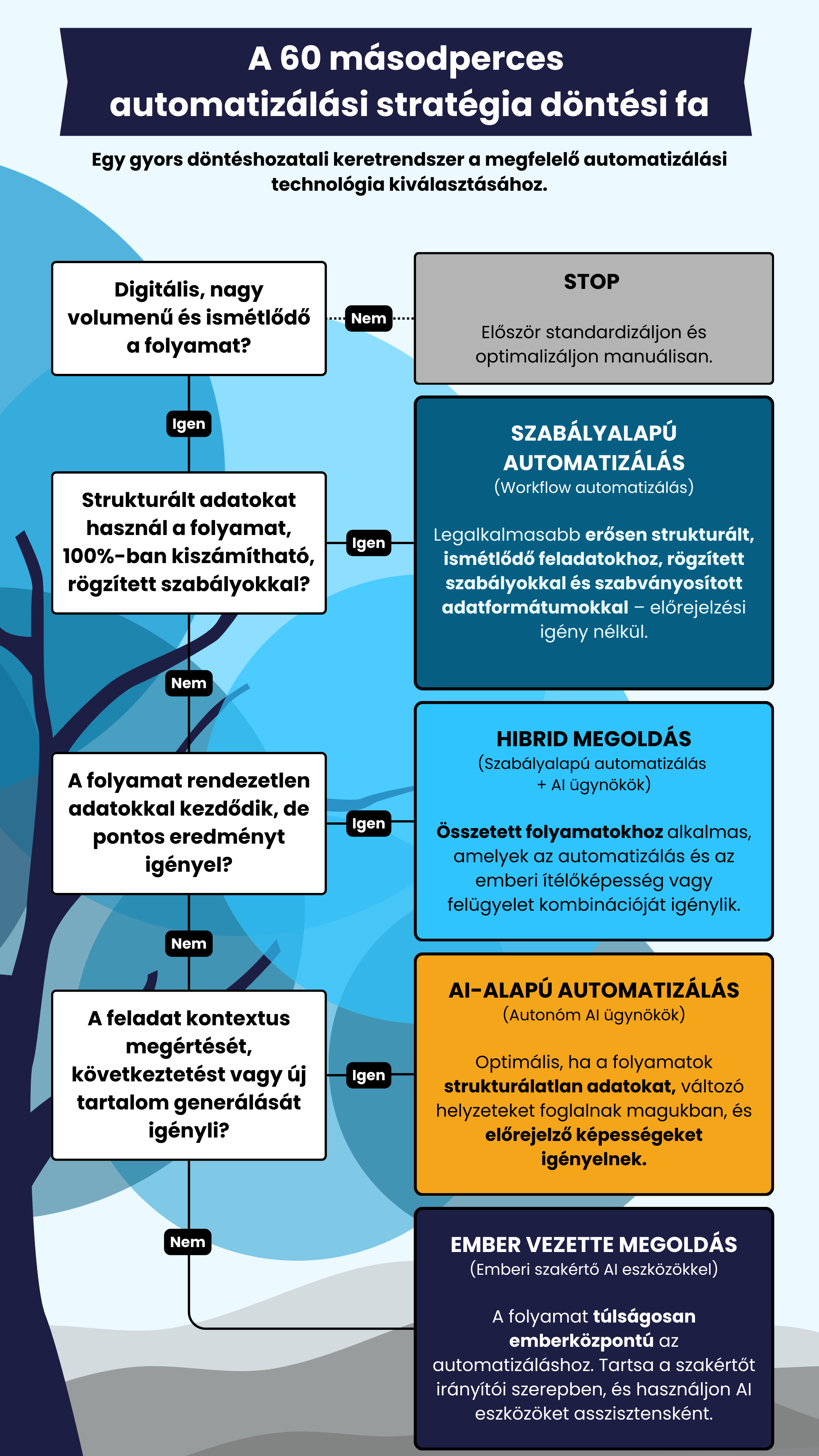 A szabályalapú automatizáció továbbra is a gerincét alkotja a megbízható, auditálható és költséghatékony folyamatoknak. Az AI ott teremti meg a valódi értéket, ahol a komplexitás, a strukturálatlan adatok vagy a prediktív igények ezt indokolják.